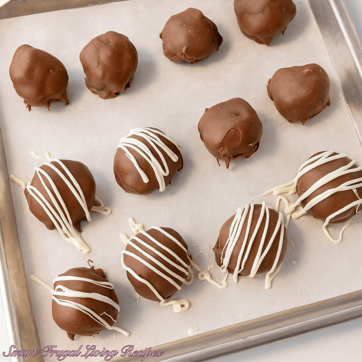 - Using a fork or toothpick, dip each ball into the melted chocolate, letting excess drip off.